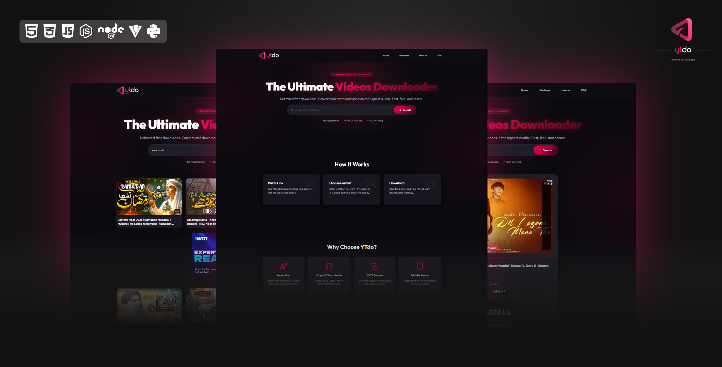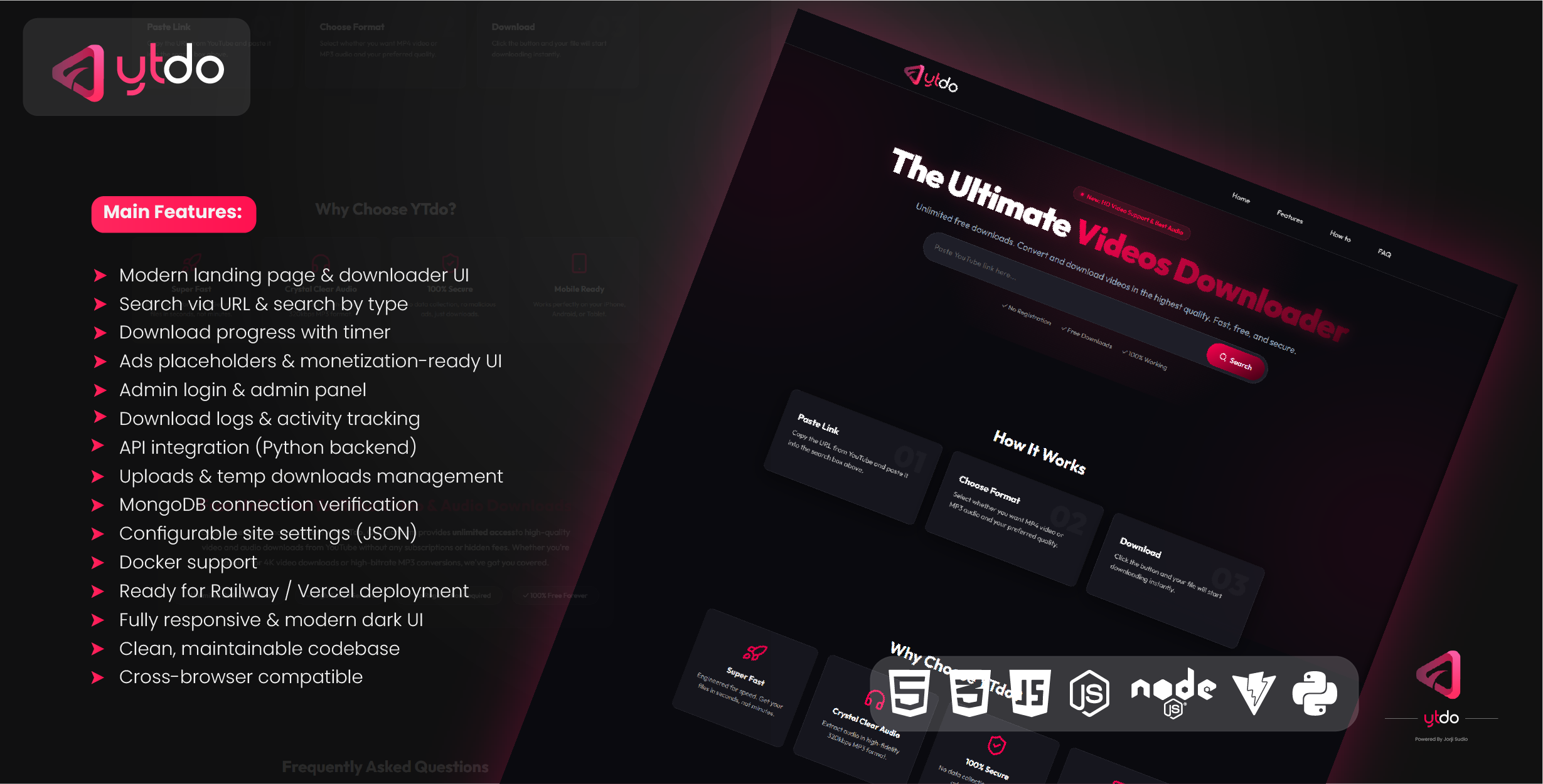 YT Video Downloader is a complete full-stack media downloader web application designed for developers and startups who want to launch a professional downloader or media utility platform. The project includes a modern frontend built with HTML, CSS, JavaScript, JSX (Vite), and a Python backend with *** endpoints, download logic, logging, configuration, and deployment support.